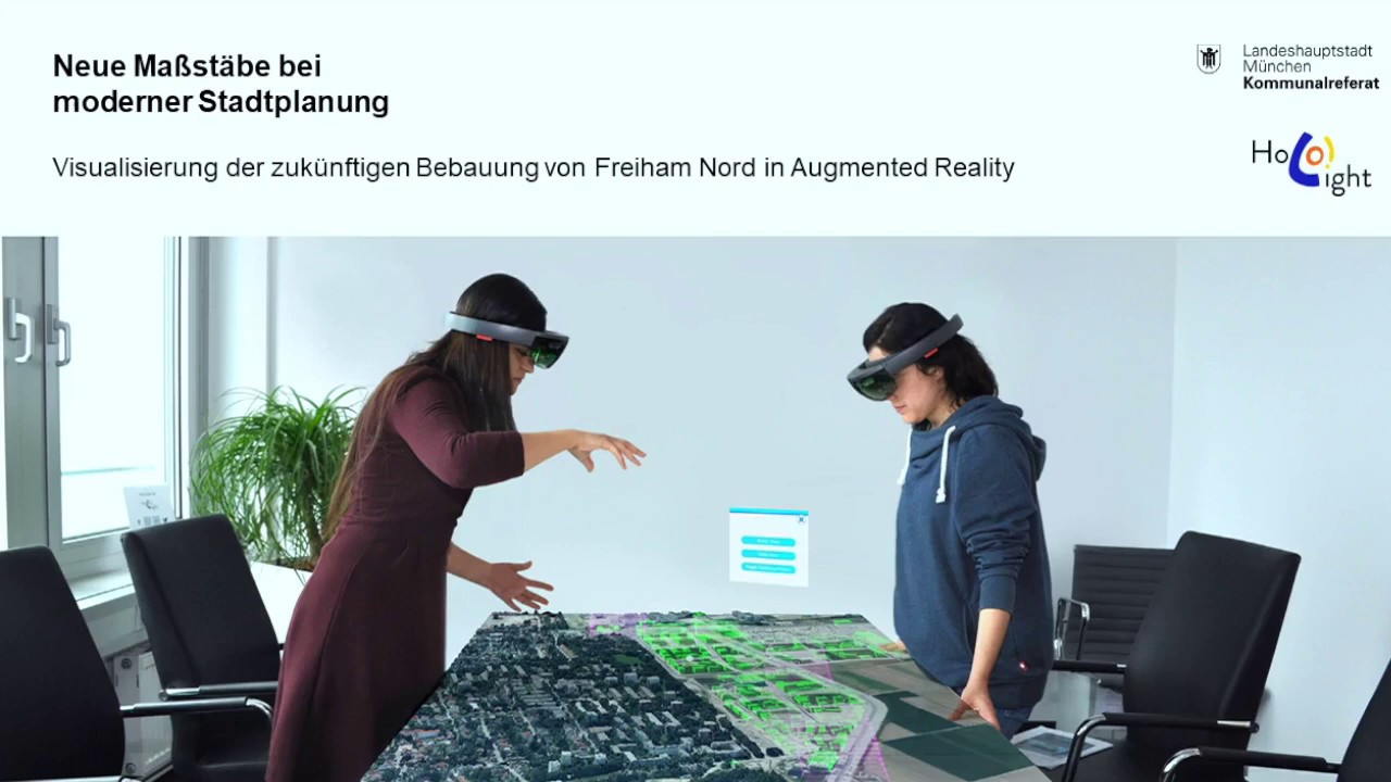 Von der Planung bis zum fertiggestellten Bauvorhaben ist es ein langer Weg. Mittels AR können verschiedene Planungsideen und -schritte in der Realität visualisiert werden. AR schafft einen einfachen und immersiven Zugang, um ein besseres Verständnis der Bauentwicklung für alle Beteiligten herzustellen und eignet sich so für eine effiziente Öffentlichkeitsarbeit. Für den neuen Stadtteil Freiham wurde dieser Ansatz erfolgreich umgesetzt und getestet. Schon vor dem ersten Spatenstich konnten die maximalen Bauvolumina aus den Bebauungsplänen vor Ort in einem virtuellen Modell maßstabsgerecht betrachtet werden. Mit AR lässt sich auch ohne Fachkenntnisse ein realistischer Eindruck gewinnen, wie der Stadtteil Freiham in Zukunft aussehen wird.